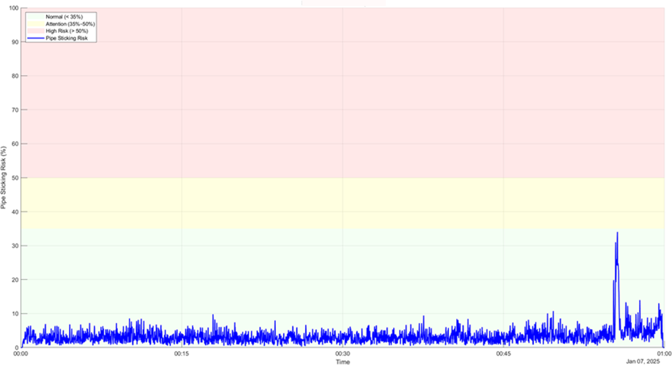 На графике можно наблюдать стабильные значения риска на протяжении большей части времени, что соответствует нормальным условиям работы буровой установки. Однако ближе к концу периода фиксируется резкий рост риска, который достигает 34 %, но остается в пределах зоны нормальных условий.