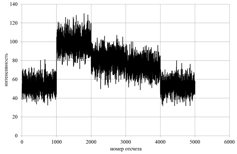 В качестве иллюстрации применения МВС (алгоритма APFLOW) рассмотрим имитирующие гамма-каротаж данные модельного эксперимента [1], представляющие собой регистрируемое датчиком число импульсов в секунду (интенсивность). На рисунке 2 помещены исходные данные, а на рисунке 3 показаны гистограммы исходной матрицы Din, построенной для этих данных по (2), и результирующей матрицы Dfin после проведения процедуры очистки от шума.