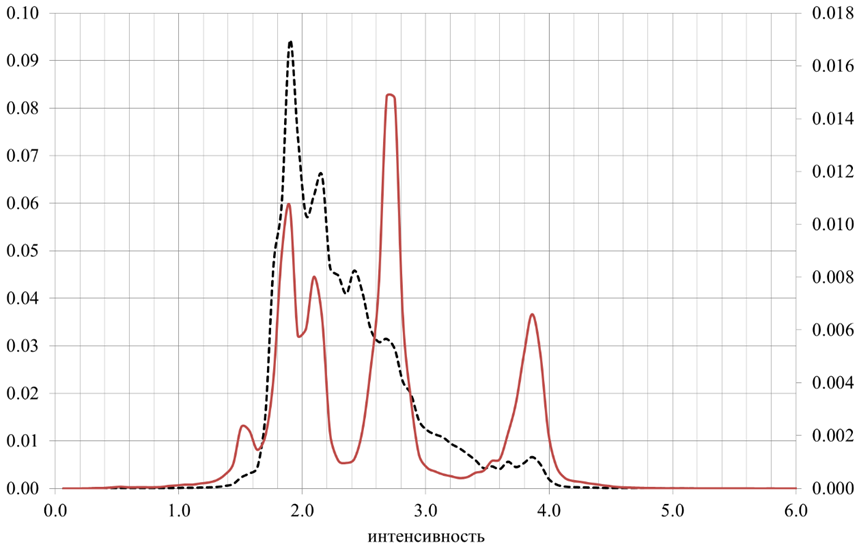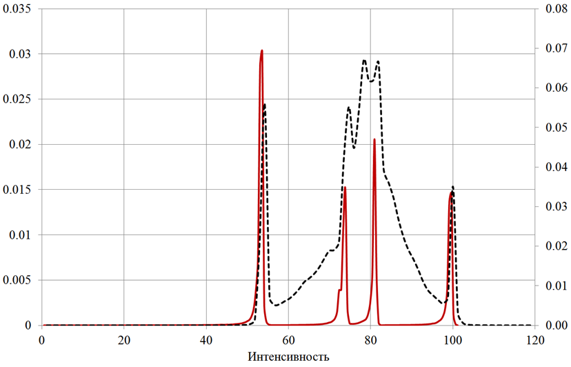 Из рисунка 3 видно, что распределение интенсивностей, относящихся к одному ИС, представляет собой дельтообразную функцию, максимум которой соответствует среднему значению данного ИС, а площадь под каждым пиком указывает на долю от общего числа вершин, формирующих данное состояние.