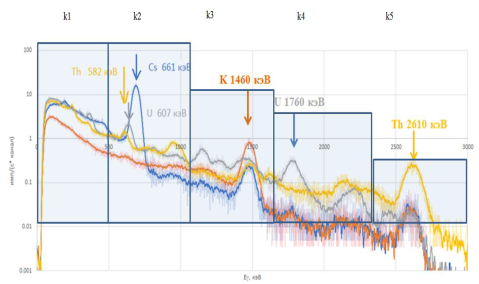 На территории Сибири была произведена пешеходная съемка с использованием гамма-спектрометра GM-GAMMA-1000 с объемом кристалла около 1000 см3 и приемником GNSS. Всего было пройдено около 60 трасс с общим количеством точек порядка 150 000. В идеале в каждой пространственной точке результатом измерения гамма-спектрометром является энергетический спектр, который показывает, сколько гамма-квантов было зафиксировано в определенном интервале энергии за единицу времени. Основные источники радиации — это изотопы атомов K, U и Th. В реальности при больших объемах проводимых исследований получаемый спектр в отдельной пространственной точке не дает возможности определять аномальные содержания указанных радиоактивных элементов в силу небольшого числа поступивших импульсов в единицу времени. По этой причине, как и в проделанных нами ранее исследованиях [2], для последующего анализа исходные данные группировались в пять интегральных каналов: k1, k2, k3, k4, k5. Количество импульсов в каждом интегральном канале получалось суммированием по идущим подряд аппаратурным каналам (от 1 до 4084). Причем границы каналов k2, k3, k4, k5 подбирались таким образом, чтобы выделенные области энергии включали в себя основные пики, соответствующие гамма-излучению атомов Cs, K, U и Th соответственно.