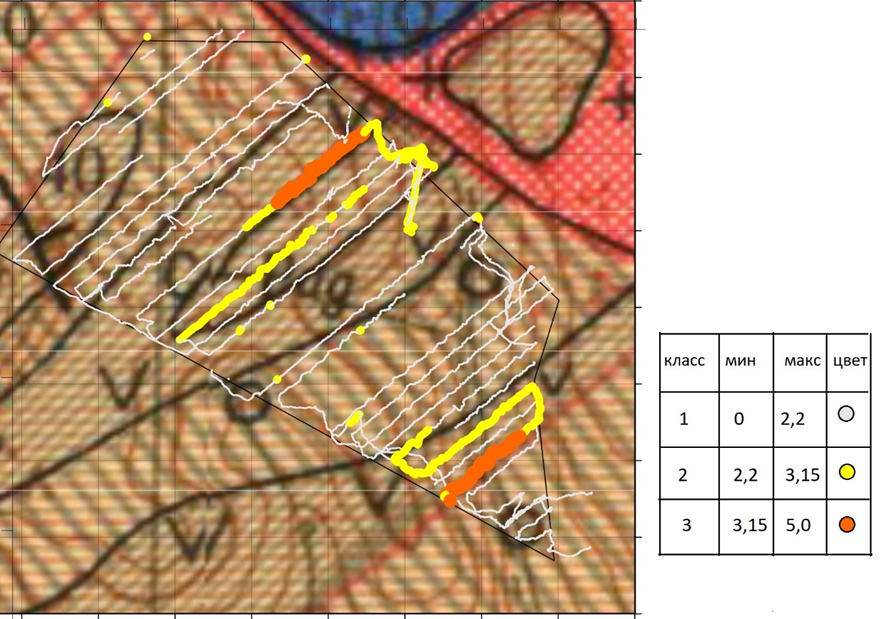 Точки, относящиеся к третьему классу, лежат на линии тектонического контакта (красная линия на геологической основе) и линии несогласного залегания пород (черная линия). Точки первого и второго класса можно отнести к рядовым (фоновым) значениям по содержанию урана.