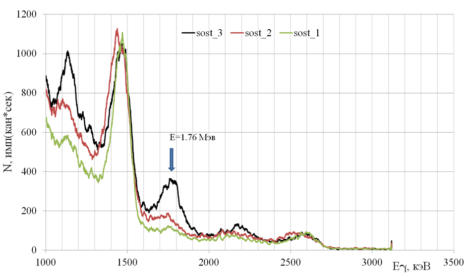 Из рисунка 6 видно, что выделяются две области, относящиеся к 3-у классу, с повышенным содержанием доли урана по спектру. Суммарный спектр точек, располагающихся в этих областях, также показывают наличие урановой аномалии. На рисунке 7 показаны сглаженные спектры, построенные по 3000 точек, входящих в каждый из трех выбранных классов. Доля урана в области E = 1760 кэВ для точек класса 3 практически в два раза превышает значения для класса 2 и в три раза фоновые значения (класс 1).