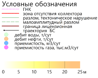 Рисунок 1. Карта текущих отборов на карте нефтенасыщенных толщин преображенского горизонта (пласт Б12) ВЧНГКМ