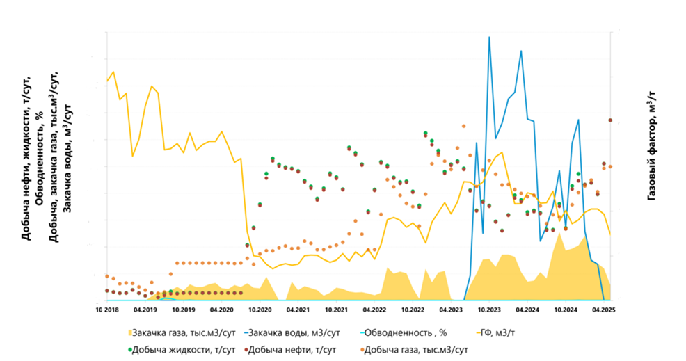 Преображенский горизонт введен в разработку в 2009 г. На объекте осуществляется закачка газа и воды в единичные скважины (рис. 1). Динамика основных показателей разработки представлена ниже (рис. 2).