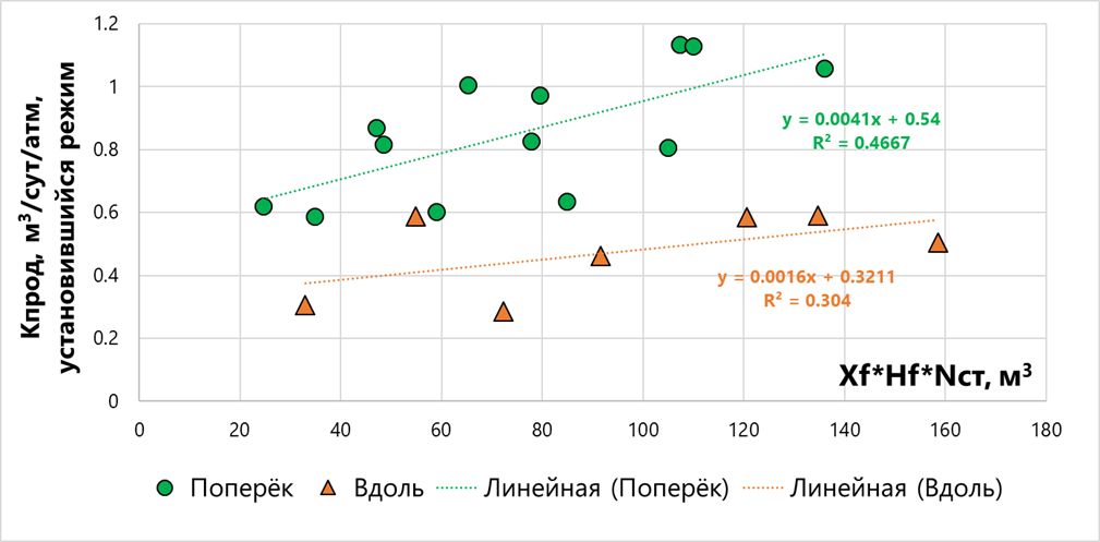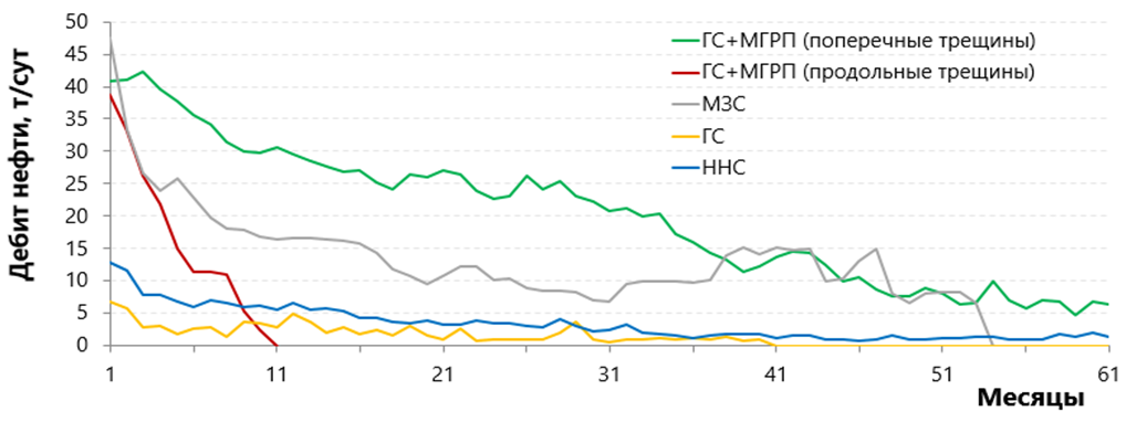 Наибольшим коэффициентом продуктивности (Кпрод) на установившемся режиме характеризуются ГС + МГРП с поперечной ориентацией трещин (рис. 3).