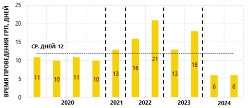 Эволюция технологии ГРП для рассматриваемого актива происходит от простого к сложному с включением учета геологических особенностей региона — до 2020 г. были опробованы различные виды заканчивания и методы по интенсификации притока. С 2015 г. в связи с выносом пропанта после проведения ГРП было введено использование RCP-пропанта. С 2020 г. в активную фазу перешло бурение ГС длиной 1000 м и 9 стадиями ГРП. За период 2020–2021 гг. проведено более 50 операций ГРП, на которых было получено 12 осложнений в виде «стопов». В период с 2021 по 2023 г. начато использование формулы для расчета трений в интервале перфорации / призабойной зоны пласта (ПЗП) на основе устьевых давлений, что позволило снизить количество осложнений вдвое при схожем количестве операций (рис. 5). Широко применяется геомеханическое моделирование для планирования ГРП.