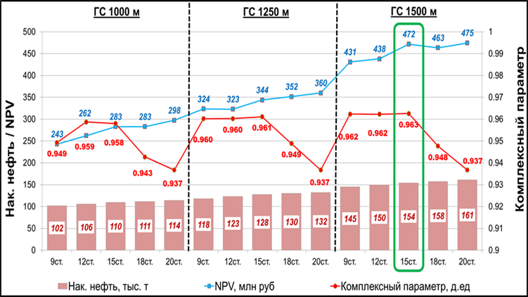По результатам опробования различных способов заканчивания скважин и определения оптимального — ГС + МГРП с поперечными трещинами — было принято решение о развитии данной технологии: увеличения стадийности ГРП и длины ГС. Далее выявление оптимальной длины и количества стадий ГРП проводилось с использованием инструментов гидродинамического моделирования (ГДМ) в корпоративном ПО «РН-КИМ». На ГДМ была проведена серия расчетов по установлению оптимальной длины ГС и количества стадий ГРП. С целью выбора оптимальной технологии в расчете использовался комплексный параметр, который включает в себя показатели накопленной добычи нефти за 20 лет, запускной дебит скважины, риски успешности проведения ГРП (зависят от количества стадий ГРП), риски успешности бурения ГС (зависят от длины ствола) и экономический показатель NPV. С учетом комплексного параметра было определено наиболее эффективное закачивание скважин на преображенский объект — ГС 1500 м с 15 стадиями ГРП (рис. 6).