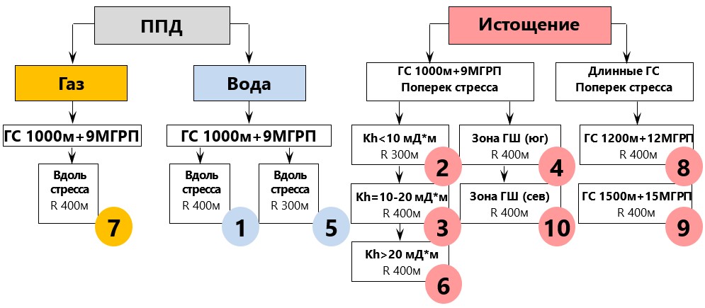 После подтверждения успешности ГС1000 + МГРП выполнено размещение фонда по данным постоянно действующей геолого-технологической модели (ПДГТМ) для формирования варианта на полное развитие. Очередность бурения планировалась с учетом представлений о ФЕС по данным транзитного бурения, результатов первичных и повторных испытаний. На основе полномасштабных гидродинамических расчетов в ПО «РН-КИМ» определена условная зависимость между накопленной нефтью и Кh, выполнено итоговое ранжирование фонда и заложение объемов для эксплуатационного бурения. Запланировано бурение 255 скважин с применением технологии ГС+МГРП со средним запускным дебитом — более 40 т/сут. Подготовлена схема отработки технологий для подтверждения полномасштабного разбуривания (рис. 7).