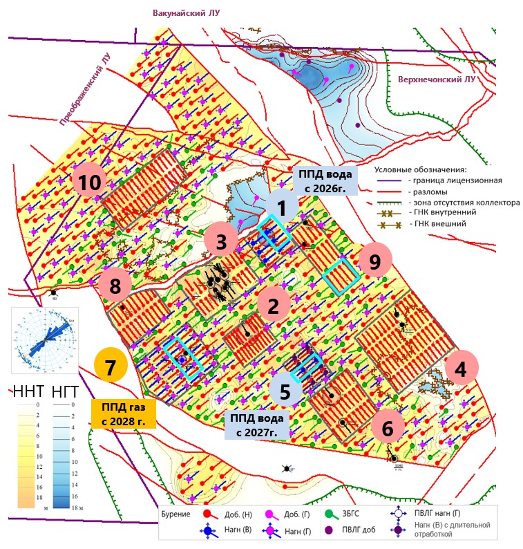 Одним из главных вызовов при разработке преображенского горизонта в период 2025–2027 гг. будет реализация ячейки заводнения на одной из кустовых площадок, в результате которого будет принято дальнейшее решение о реализации системы поддержания пластового давления на объекте Б12 и о выборе агента воздействия. В проектном документе 2024 г. рассмотрены как проектные участки, предполагающие разные типы заводнения, так и истощение для определения оптимальной системы разработки. Также в ближайшее время при проведении работ по ГРП будет опробована закачка кварцевого песка как альтернатива стандартного керамического пропанта с целью оптимизации проведения работ.