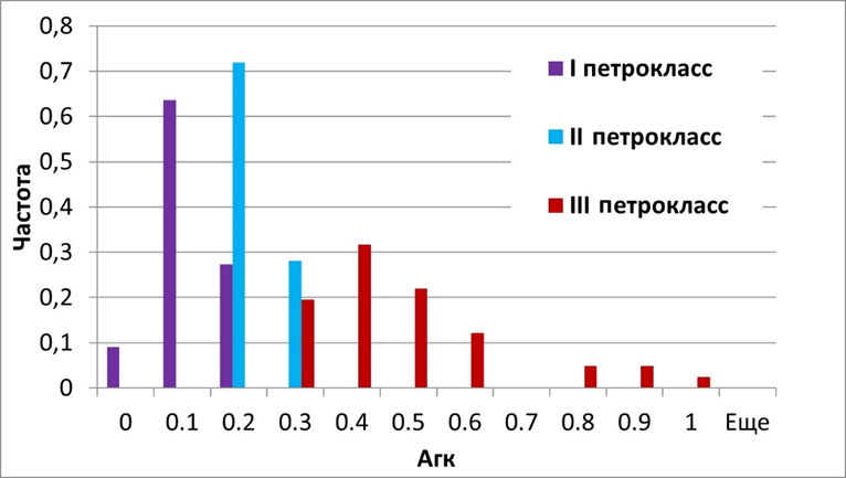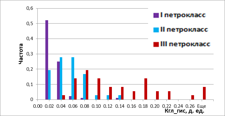 Рисунок 1. Распределение коэффициента глинистости, рассчитанного по ГИС в петроклассах, выделенных по керну