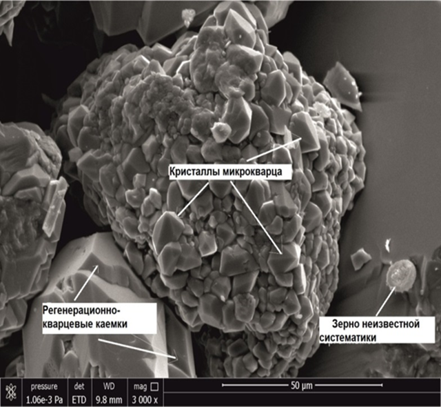 Результаты исследования на СЭМ показали, что наряду с «типичными» зернами кварца отмечается значительная доля обломков угловатой, неправильной формы кварца мельчайших размеров (от 5 мкм). Данная размерность кварца в гранулометрии попадает в пелитовую составляющую (рис. 4).