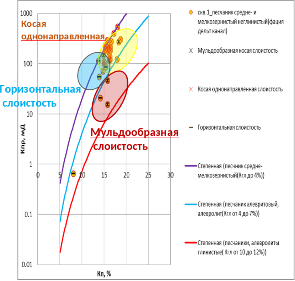 Для построения петрофизической модели по скважинам, где на основе описания керна проведена литологическая типизация, был осуществлен комплекс лабораторных исследований стандартных образцов керна. В него входило измерение пористости, проницаемости, остаточной водонасыщенности, электрических параметров, а также изучение гранулометрического и минералогического состава. Поскольку глинистость значимо влияет на петрофизические параметры, породы по данным гранулометрического анализа были распределены по группам в зависимости от размера зерен, с учетом доли пелитовой фракции [2]. Наблюдалась устойчивая тенденция роста содержания глинистой фракции по мере уменьшения зернистости пород.