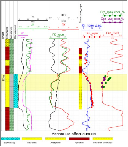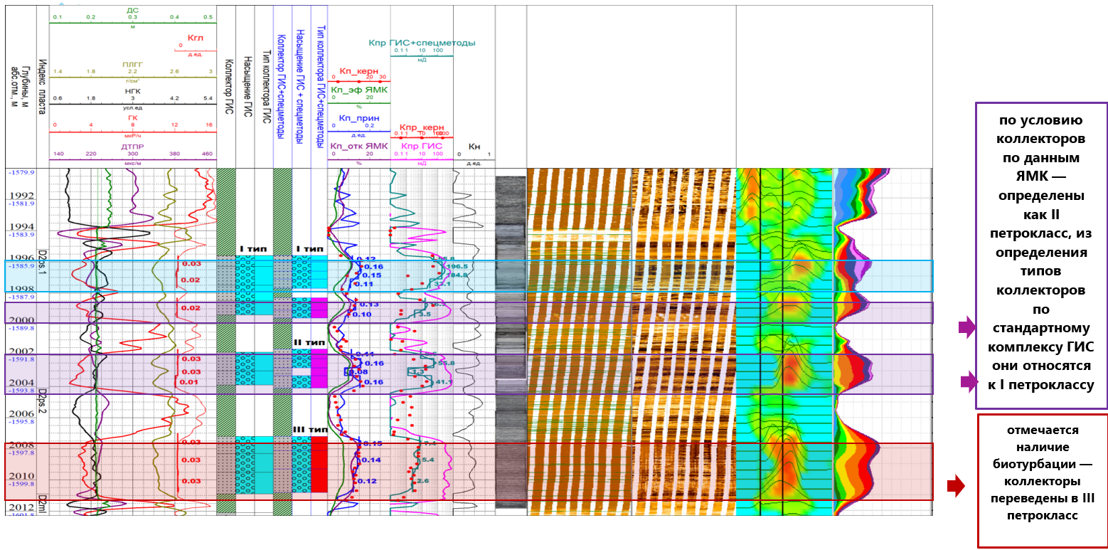 При обработке данных стандартного комплекса ГИС (ГК, НК, ПС) эти интервалы были бы ошибочно отнесены к разряду неглинистых песчаников I петрофизического класса, что автоматически привело бы к завышенной оценке его фильтрационно-емкостных свойств (ФЕС).