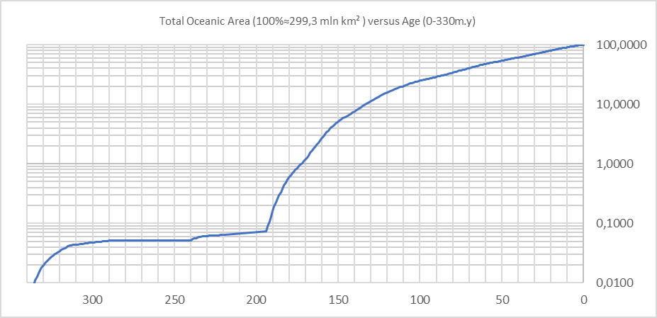 Рисунок 2. Три стадии субэкспоненциального роста современной площади Мирового океана от 0,02 % до 100 % (от 0,06 до 299,3 млн км2) за последние 330 млн лет