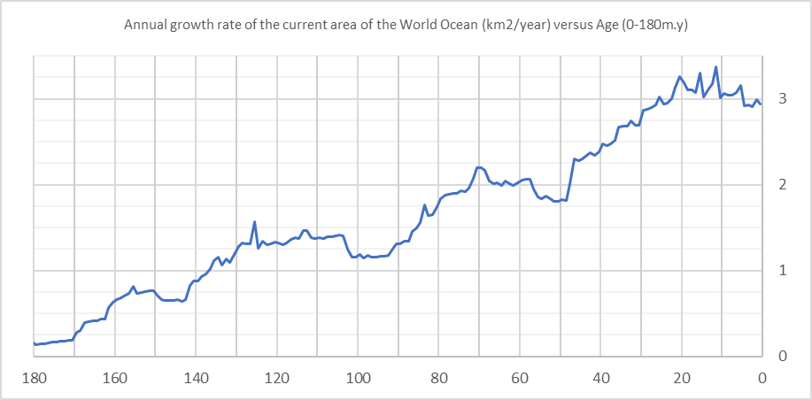 Рисунок 3. Скорость ежегодного роста (км2/год) современной площади Мирового океана за 180 млн лет